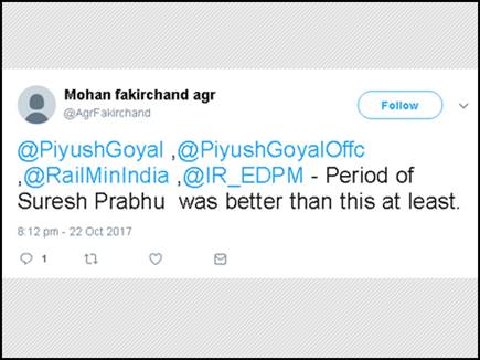 मंथन न्यूज़ पूनम पुरोहित आपका मैनेजमेंट तो कमजोर है। इससे अच्छा तो सुरेश प्रभु (तत्कालीन रेलमंत्री) का दौर था। कम से कम समस्या तो सुनी जाती थी और यात्रियों को तत्काल मदद मिलती थी। मौजूदा रेलमंत्री पीयूष गोयल के ट्विटर हैंडल पर यह बात जयपुर-मैसूर सुपरफास्ट ट्रेन में सफर कर रही महिला यात्री के पति ने लिखी। महिला रविवार को नागपुर से अपने बेटे के साथ ट्रेन में बैठी थी।